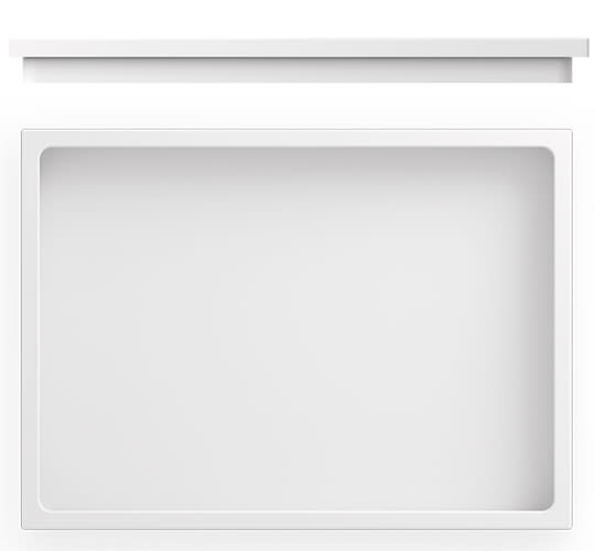 Arbeitsplatte aus Corian® mit aufgesetzter rechteckigen-becken, integrierte abschlussleiste, farbe Glacier White, aubfluss und verchromter mischbatterie.