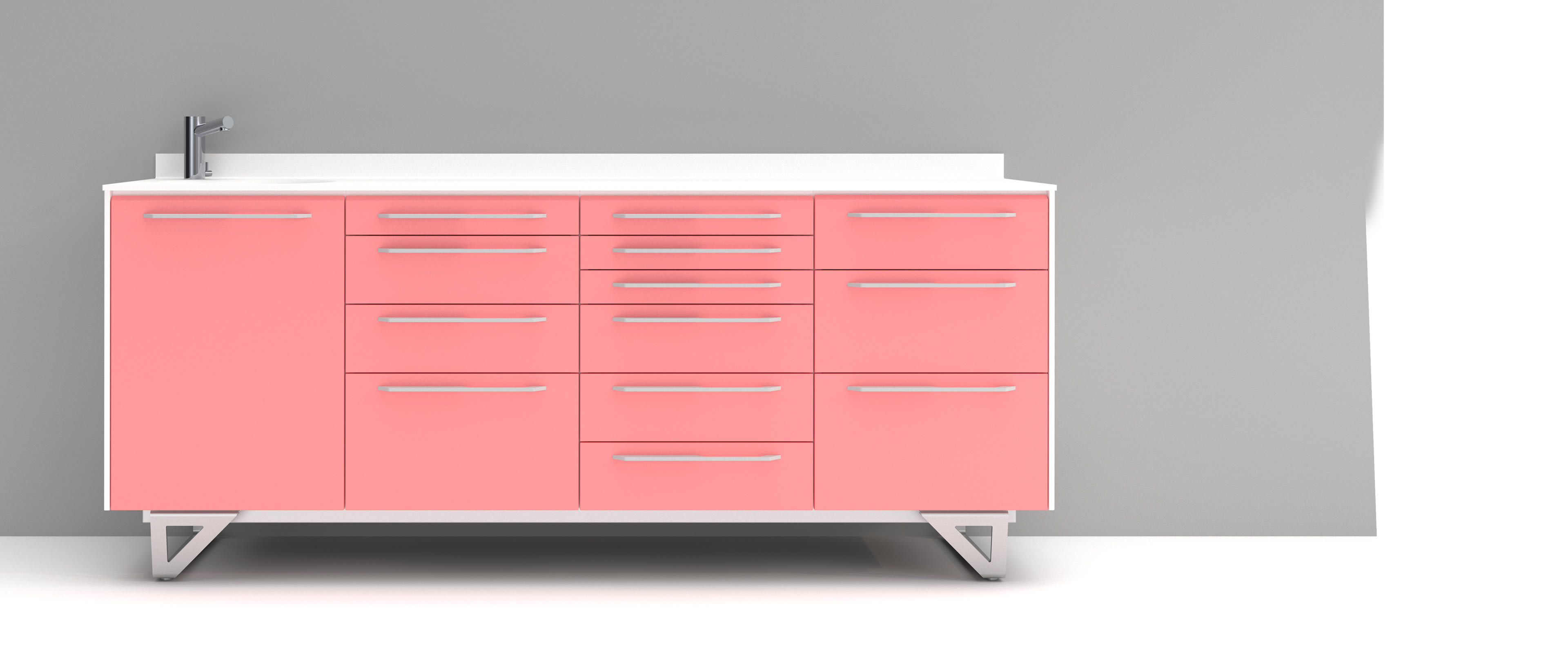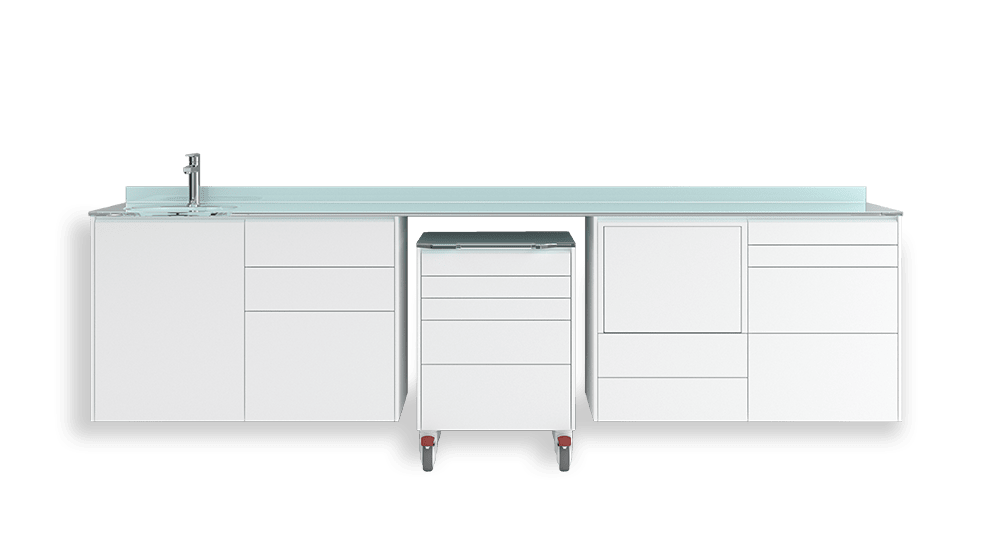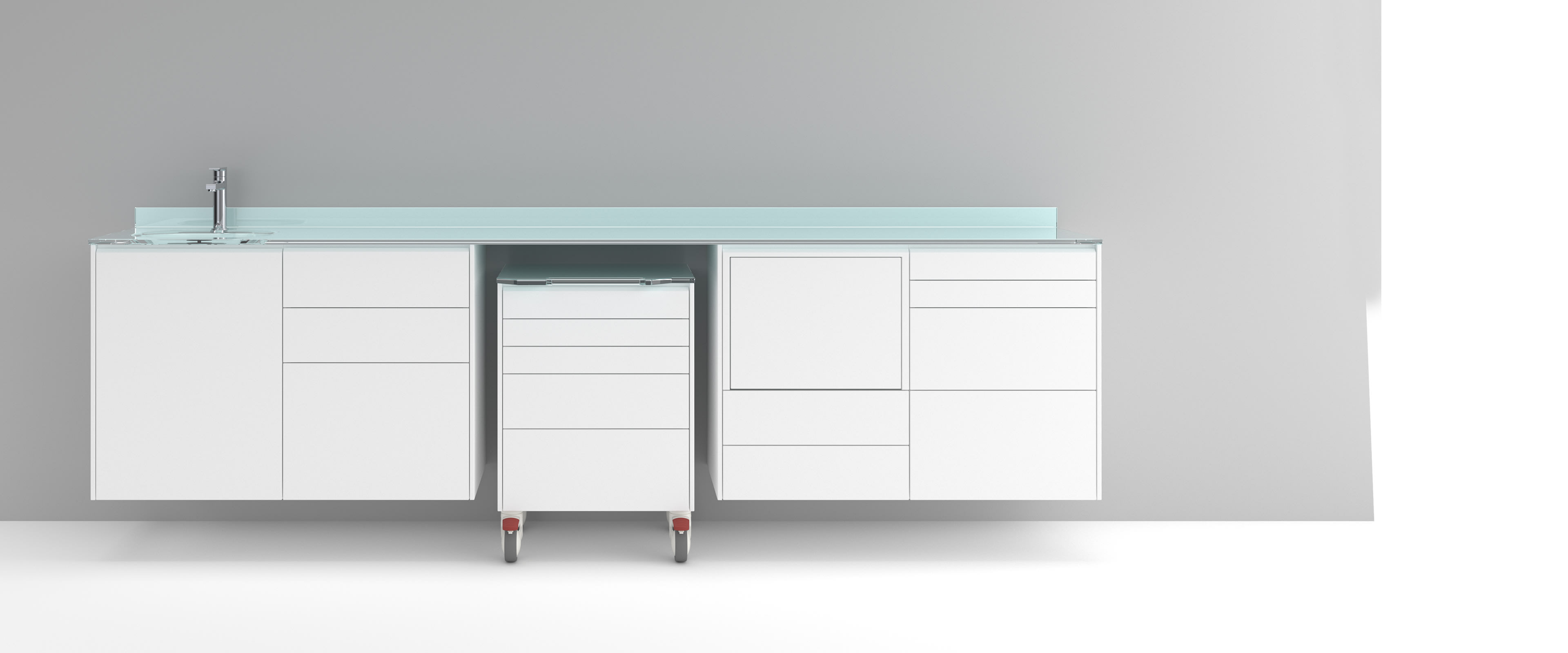 ALTEA ist die neue, ästhetisch innovative und fesselnde Möbelzusammensetzung . Es gibt drei Optionen für die Halterung: Wandbefestigt, Bodensupport auf Stahl oder geschlossener Sockel. Die umlaufende Staublippe kann nicht nur die Module, sondern auch, auf Anfrage, jede einzelne Schublabe umgeben. Der abgestimmte Rollwagen ist besonders funktional. Ein originelles und charakteristisches ästhetisches Detail ist die Neigung des oberen Teils der Schubladen und der Tür.