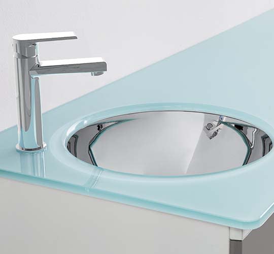 Arbeitsplatte aus Glas mit thermoverschweißtem rechteckigen oder runder becken, aubfluss und verchromter mischbatterie.