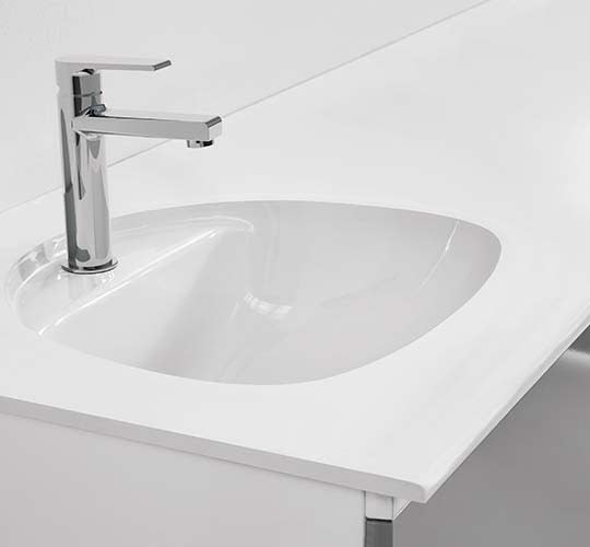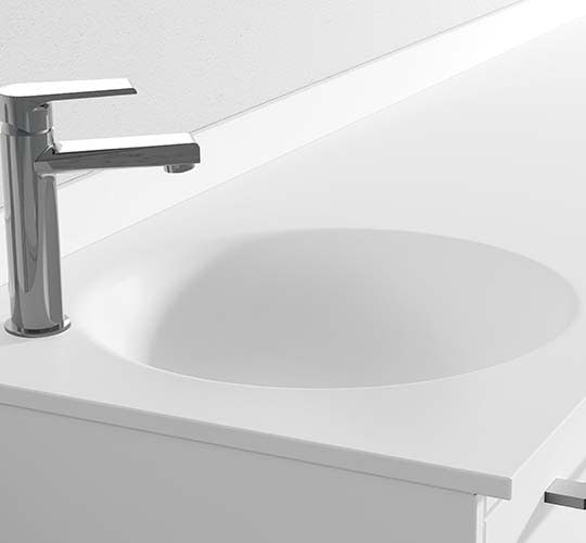 Arbeitsplatte aus Corian® Glacier White mit thermoverschweißtem runder Spüle, abschlussleiste aus Corian®, aubfluss und verchromter mischbatterie.