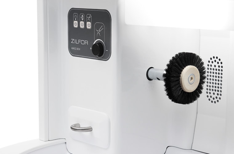 Amico Box is equipped with a single shaft brush with high functionality, an high polisher performance, a silent suction system with high functionality, a lamp with high colour rendering, a master switch and also switches for all devices, a polycarbonate protection with a central plexiglas plate to protect the working area, synthetic fibres filter bags for raising dust and the lodging for any brand of rheostat and micromotor.