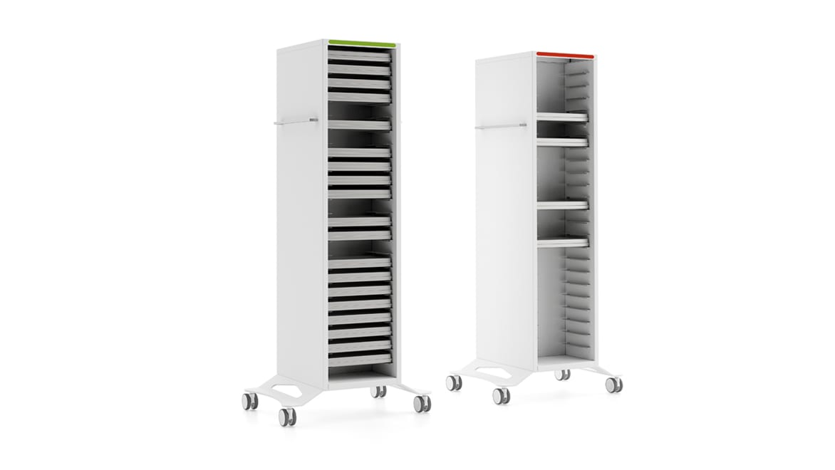 A special double-faced instruments holder container on wheels. One side has trays for the storage of sterile instruments and the other side is used for collection, in protected containers, for all used and infected instruments or waste material.