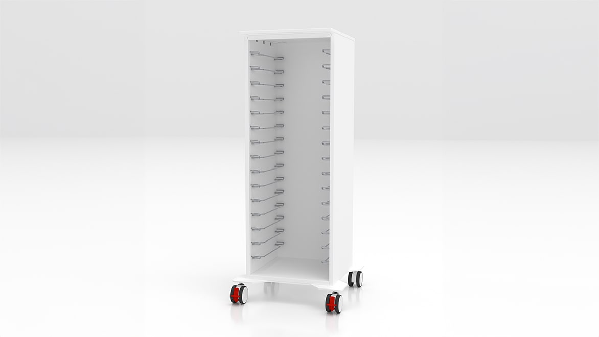 Trolley designed to accommodate medium and large Zirc trays. Available with or without white satined glass door.