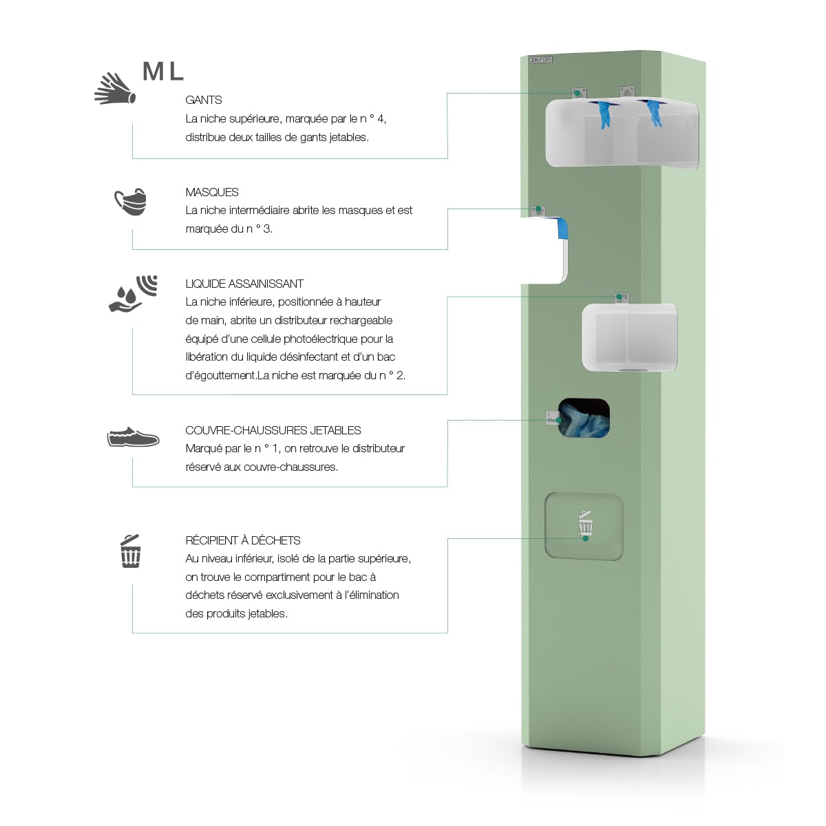Les niches, qui abritent le liquide désinfectant et les gants, les masques et les couvre-chaussures jetables, sont marquées de plaques d’identification et numérotées de manière à communiquer précisément sur l’utilisation des produits.